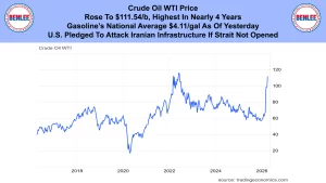 Crude oil WTI price rose to $111.54/b. the highest in nearly 4 years. Gasoline’s national average price was $4.11/gal. as of yesterday. The U.S. pledged to attack Iranian infrastructure if the Strait is not opened.