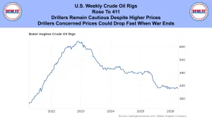 U.S. weekly crude oil rigs rose to 411 as drillers remain cautions despite higher prices. Drillers are concerned prices could drop fast when the war ends.