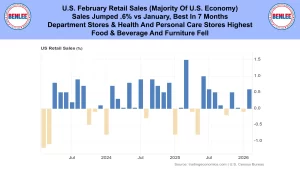 U.S. February retail sales, which is a majority of the U.S. economy. Sales jumped .6% from January the best in 7 months. Department stores and healthcare/personal care stores rose the highest as food and beverage and furniture fell.