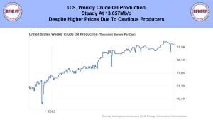 U.S. weekly crude oil production was steady at 13.657Mb/d. This was despite higher prices, due cautious producers.
