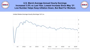 U.S. March average annual hourly earnings increased 3.5% vs last year the lowest increase since May 2021. A low number helps keep inflation down, but is bad for workers.