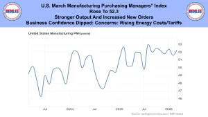 U.S. March manufacturing purchasing manager’s index rose to 52.3. This was on stronger output and increased new orders. But business confidence dipped on concerns over rising energy costs and tariffs.
