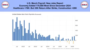 U.S. March payrolls, the new jobs report. The economy added 178,000, the most since December 2024. Healthcare rose 76,000, but 35K were the return after a strike. Construction gained 26,000.
