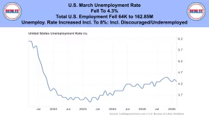 U.S. March unemployment rate fell to 4.3%. Total employment fell 64,000 to 162.85M. The unemployment rate increased to 8% for the measure that also includes discouraged and underemployed workers.